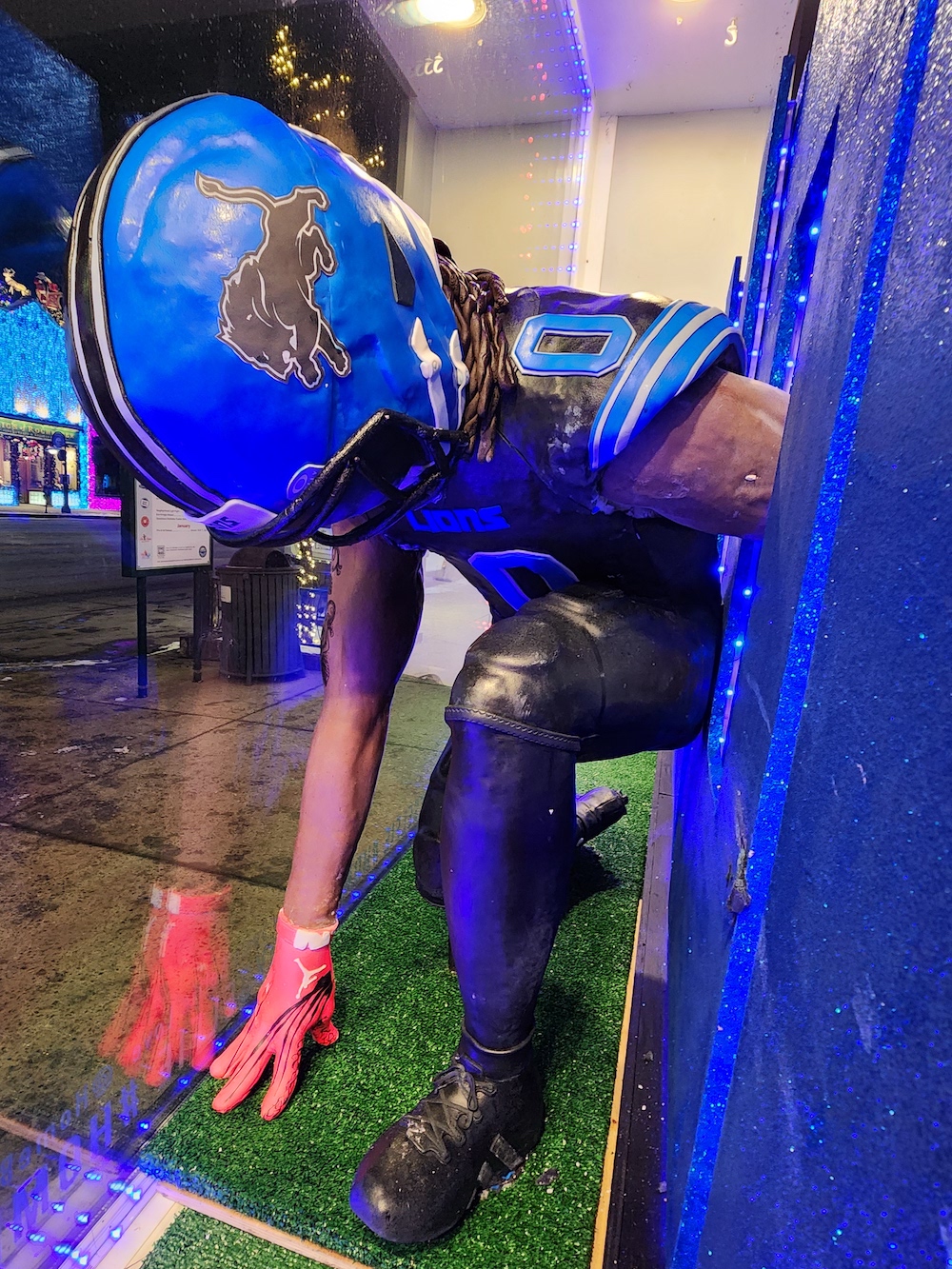 Now, they’ve just unveiled a cake displayed in their front window of the Superman–Spiderman pose made famous this season by Detroit Lions’ Amon-Ra St. Brown and running back Jahmyr Gibbs against the Tampa Bay Buccaneers.